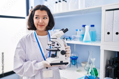 Young hispanic woman working at scientist laboratory holding microscope smiling looking to the side and staring away thinking.