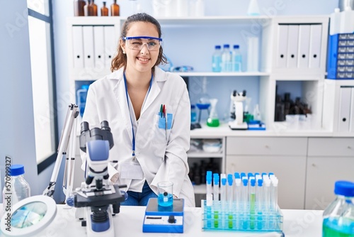 Young hispanic woman working at scientist laboratory winking looking at the camera with sexy expression, cheerful and happy face.