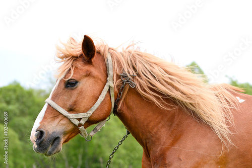 Young horse grazing in the meadow /Young horse grazing in the meadow near forest on the farmland