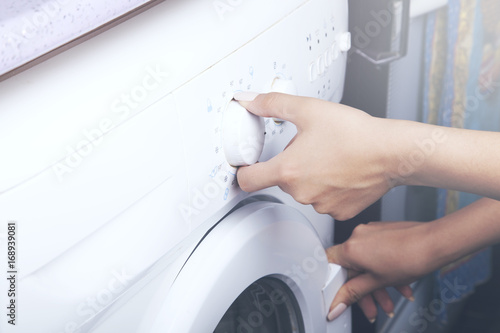 young housewife hand on washing machine