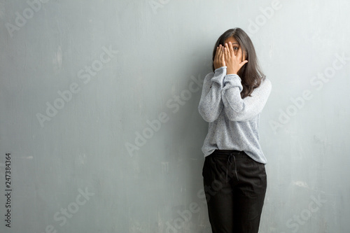 Young indian woman against a grunge wall feels worried and scared, looking and covering face, concept of fear and anxiety