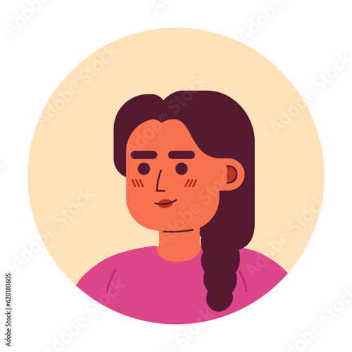 Young indian woman semi flat vector character head. Editable cartoon avatar icon. Brunette with braid hairstyle. Face emotion. Colorful spot illustration for web graphic design, animation
