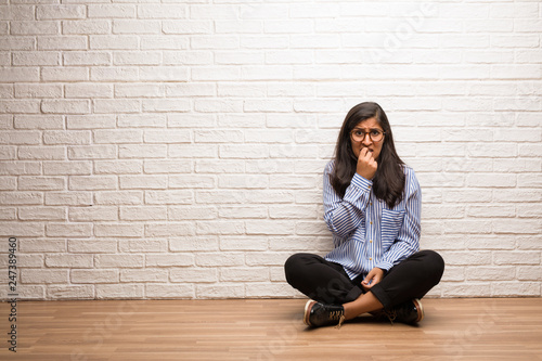 Young indian woman sit against a brick wall biting nails, nervous and very anxious and scared for the future, feels panic and stress