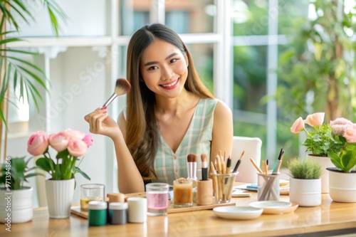 Young Indonesian Woman with Beaming Smile Enjoys Makeup Application in a Serene, Brightly Lit Room