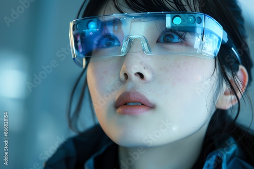Young Japanese woman wearing MR glasses with computer screen reflection