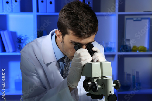 Young laboratory scientist looking at microscope in lab