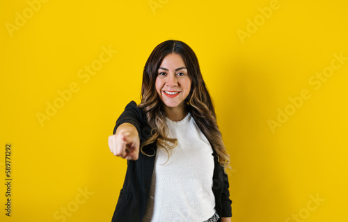 young latin business woman with pointing finger and copy space posing isolated over yellow background in Mexico Latin America