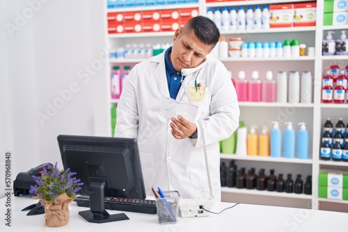 Young latin man pharmacist talking on telephone reading prescription at pharmacy
