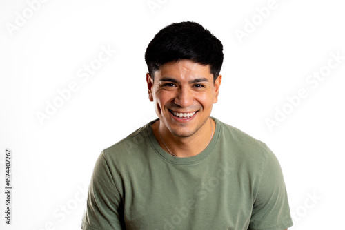 Young Latin man, smiles looking at the camera, wearing green clothing, in white environment
