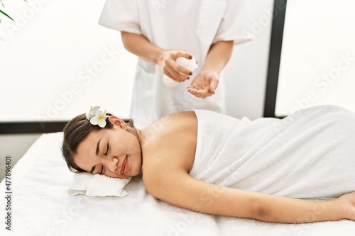 Young latin woman relaxed having back massage with moisturizer at beauty center