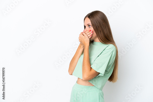 Young Lithuanian woman isolated on white background covering mouth and looking to the side