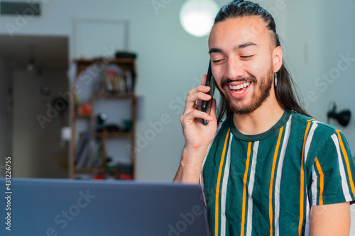 young long-haired latino man working or studying from home while talking on a smart phone and laughing, with a computer.