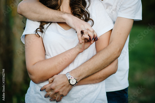 Young lovers pair, held of hands against the background of nature. view of couple on standing, women and man. upper half. Close Up.