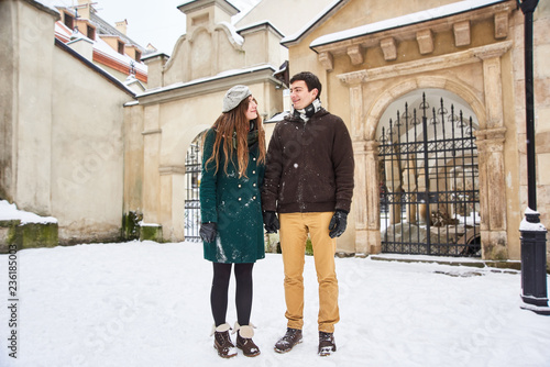 Young loving couple dressed in plaid scarves walk at the old city in winter