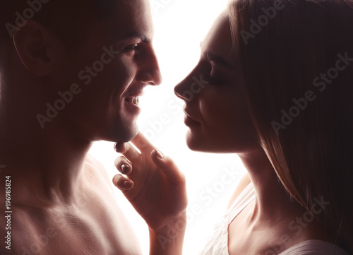 Young loving couple on white background