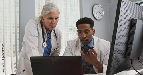 Young male black doctor talking on smartphone while working with colleague on laptop computer. Two medical doctors using technology inside office