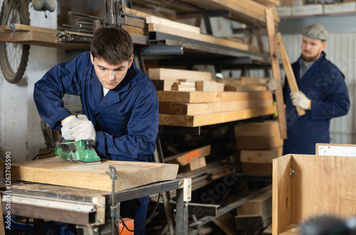 Young male carpenter polishes wooden plank with polishing machine in wood workshop
