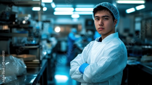 Young Male Chef in Kitchen Wearing Protective Gear and Focusing