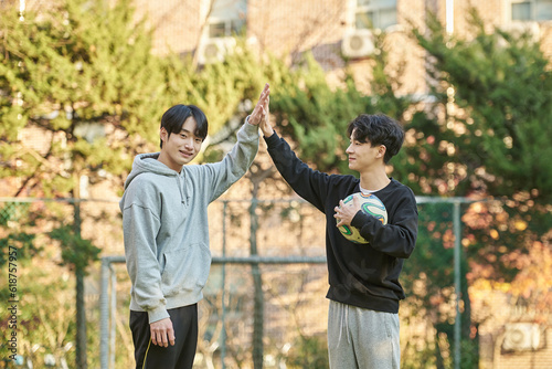 Young male college students pose for a post-match shoulder rub at a university futsal field in South Korea, Asia