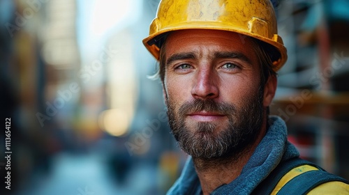 Young Male Construction Worker Smiling at Job Site with Yellow Hard Hat and Natural Light