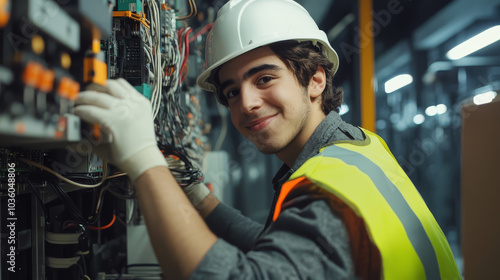 young male engineer in hard hat and safety vest works on electrical wiring in industrial setting, smiling confidently