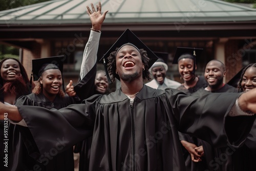 Young male graduate, wearing his cap and gown, tossing his mortarboard into the air in a triumphant gesture. Generative AI