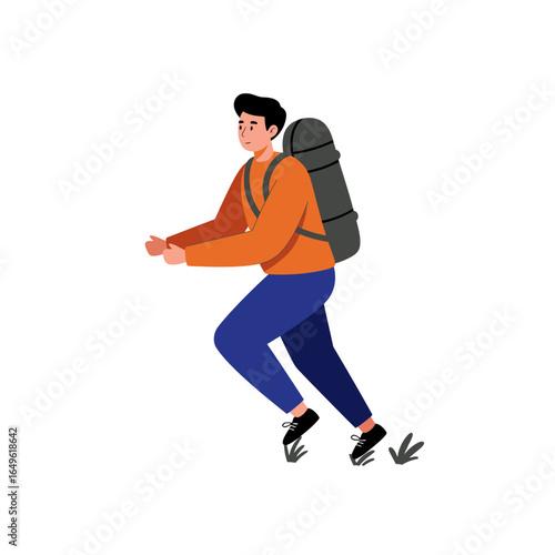 Young male hiker in an orange sweater and blue pants walking with a large grey backpack flat vector illustration.