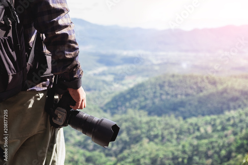 Young male hiker is holding a camera with backpack relaxing on top of a mountain - scenery from vacation - photo with space for your montage.