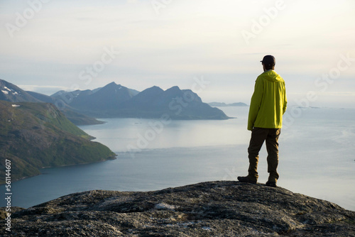 Young male hiker stands at the top of a mountain near Tromsø Norway overlooking fjords