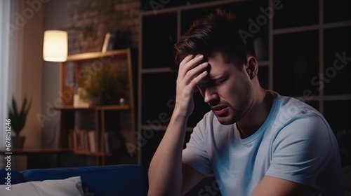 Young male holding his head in home environment. Headache and tiredness. Depressive state. Poor health and symptoms of a cold