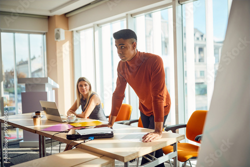 Young male lecturer giving a business lecture in a conference room. Business, people, company