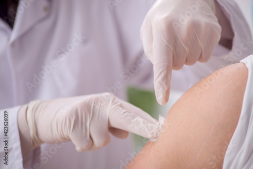 Young male patient visiting old male doctor in vaccination conce