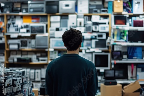 Young male shopping for electronics in store with gadgets and devices on shelves