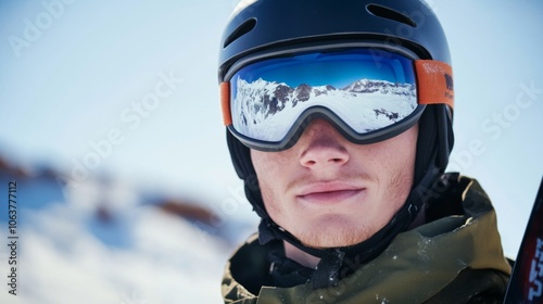 Young Male Skier with Helmet and Goggles, Carrying Skis Against Snowy Mountain and Blue Sky Background