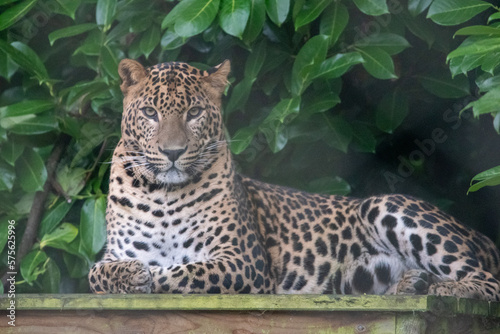 Young male Sri Lankan leopard laying on wooden platform. Banham Zoo, Norfolk, UK