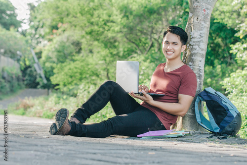 young male student with laptop smiling while studying online