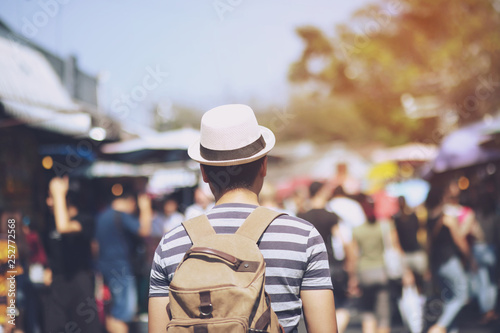 Young male traveler traveling backpacker walking street market in among the many people., filler Vintage Tone and Selective Soft Focus.