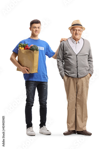 Young male volunteer holding a grocery bag and standing next to elderly man