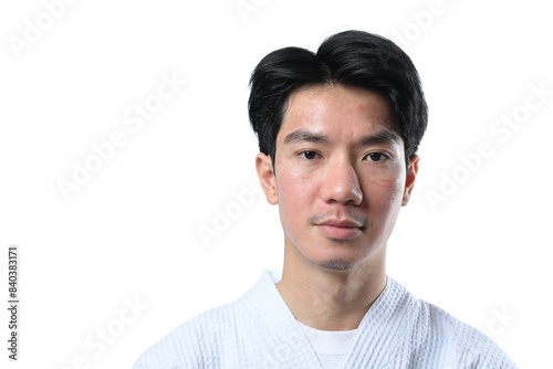 Young man after CO2 laser treatment on white background. Aesthetic face treatment concept