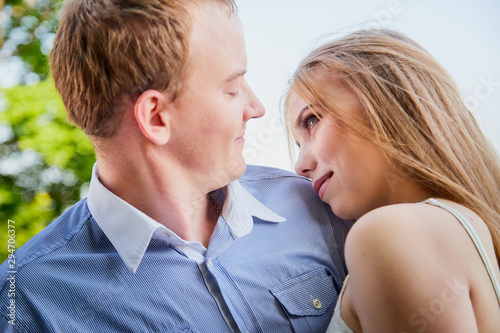 Young man and woman couple walk in the park. Spring or summer love story. Young happy family