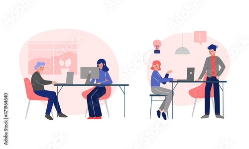 Young Man and Woman Office Employee Engaged in Workflow Vector Scene Set