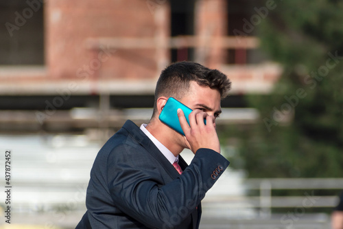 Young man businessman in business suit conducts telephone conversation, using mobile phone, outside on city street on blurred background of building construction site