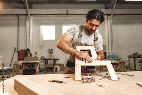 Young man carpenter wearing uniform working in joinery making wooden furniture