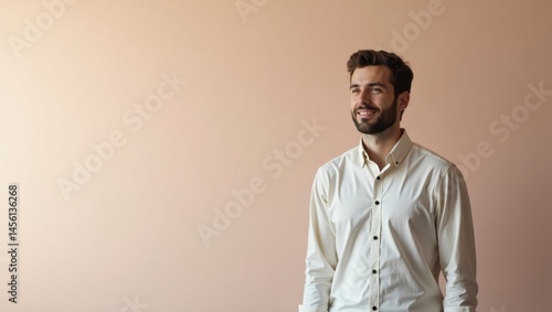 Young man. Casual style. Light background. Studio photo. Smiling face. White shirt. Millennial adult. Positive mood. Business casual. Corporate headshot. Modern style. Professional look. Male portrai