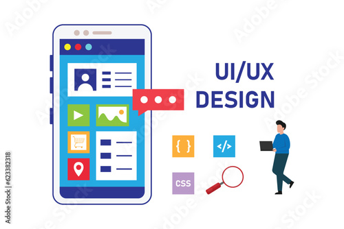 Young man creates a custom design for a mobile application 2d vector illustration concept for banner, website, illustration, landing page, flyer, etc.