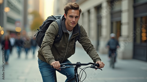 Young Man Cycling Through Urban Streets With a Backpack During Busy Hours