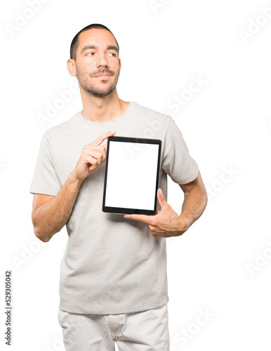 Young man doing gestures using a tablet
