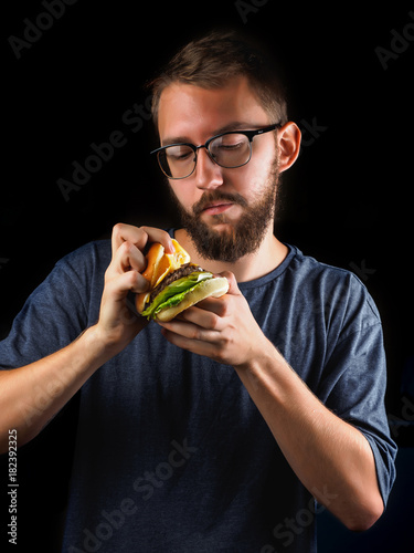 young man eating a fast food hamburger isolated on black