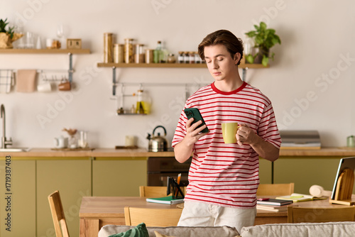 Young man engages in remote study while enjoying a drink in a modern apartment setting