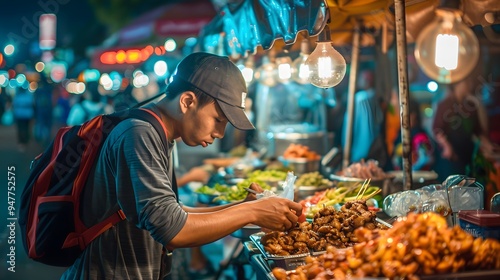 Young Man Exploring Asian Night Market Street Food